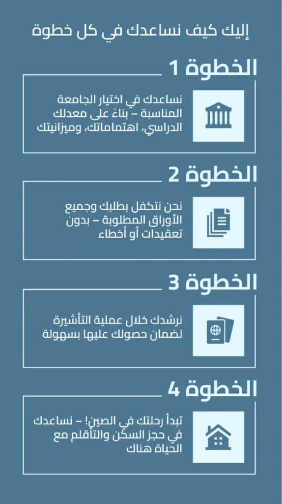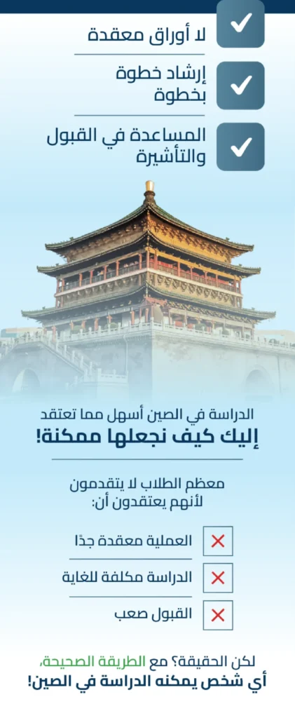 استمارة التسجيل الإسم الكامل رقم الهاتف البريد الالكتروني تاريخ الميلاد المدينة ما هو مستواك الدراسي تسجيل اضغط أدناه للحصول على استشارة مجانية و معرفة كيف يمكننا مساعدتك! احجز استشارتك المجانية الآن احجز استشارتك المجانية الآن المقاعد تمتلئ بسرعة - لا تفوت فرصتك للدراسة في الصين هذا العام! هام: الموعد النهائي للتقديم يقترب بسرعة! لماذا يجب أن تقدم الآن؟ الأولوية في القبول و المنح الدراسيةللمتقدمين مبكرا! عدد محدود من التأشيرات الطلبات المتأخرةقد لا تقبل! كلما قدمت طلبك مبكرا,زادت فرص قبولك! الوقت المتبقي Days Hours Minutes Seconds قدم طلبك الآن قبل فوات الأوان!